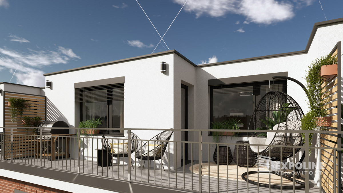 Tento prostorný byt o dispozici 3+kk se nachází v 2.NP moderního třípatrového domu a nabízí podlahovou plochu 86 m². K tomu je k dispozici prostorná terasa o velikosti 47,66 m², která poskytuje ideální prostor pro relaxaci s krásným výhledem. K bytu náleží také zděný sklep o velikosti 6,66 m², který poskytuje dostatek úložného prostoru.